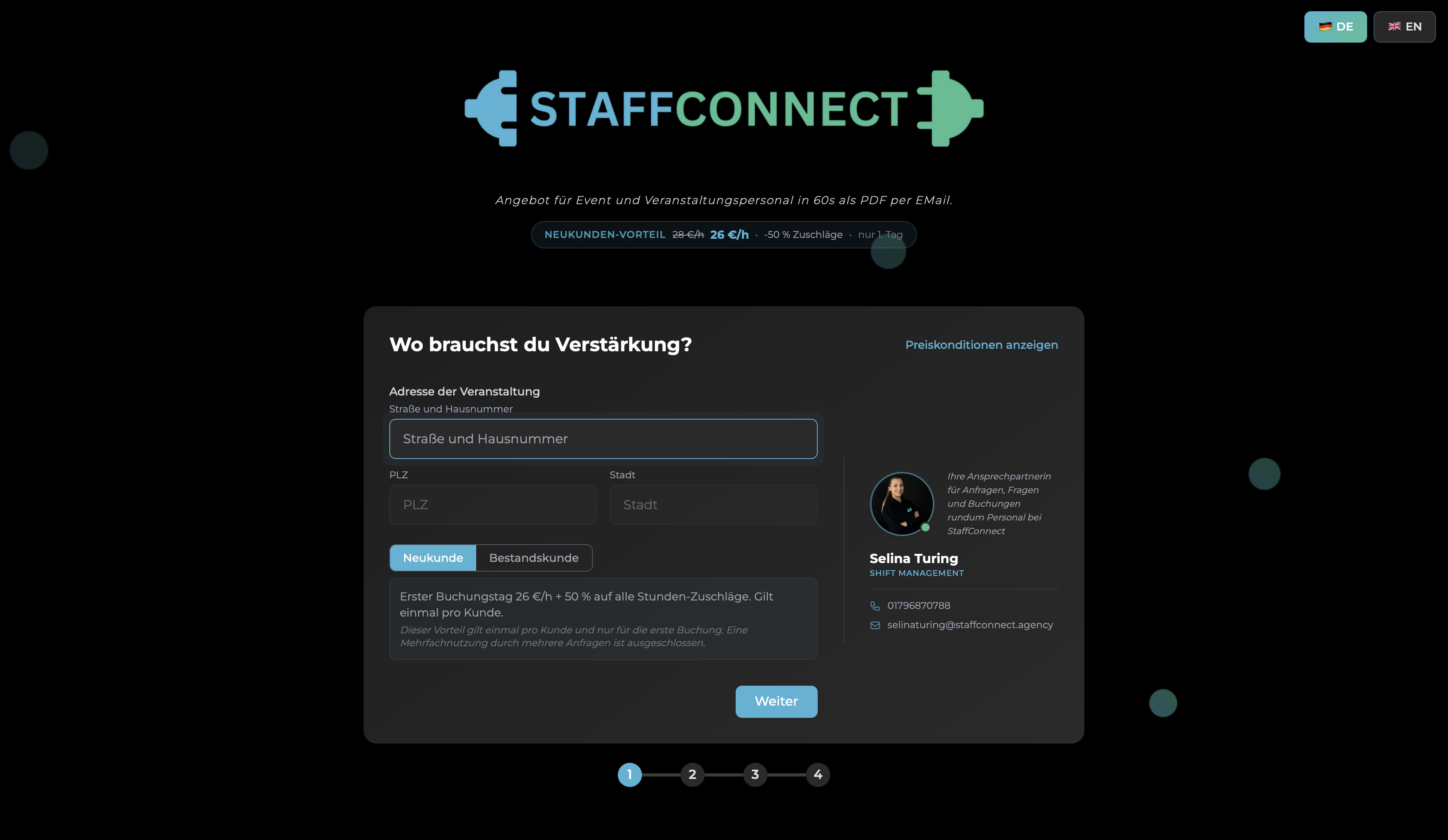 Wir haben für StaffConnect einen interaktiven Preisrechner entwickelt, der Neukunden und Bestandskunden direkt ein erstes Angebot liefert – nahtlos integriert in die bestehende Infrastruktur und angebunden an relevante APIs. Jeder Schritt ist klar und nachvollziehbar, und dank unseres Trackings pflegen wir den Rechner aktiv, optimieren ihn kontinuierlich und verbessern die Nutzererfahrung.