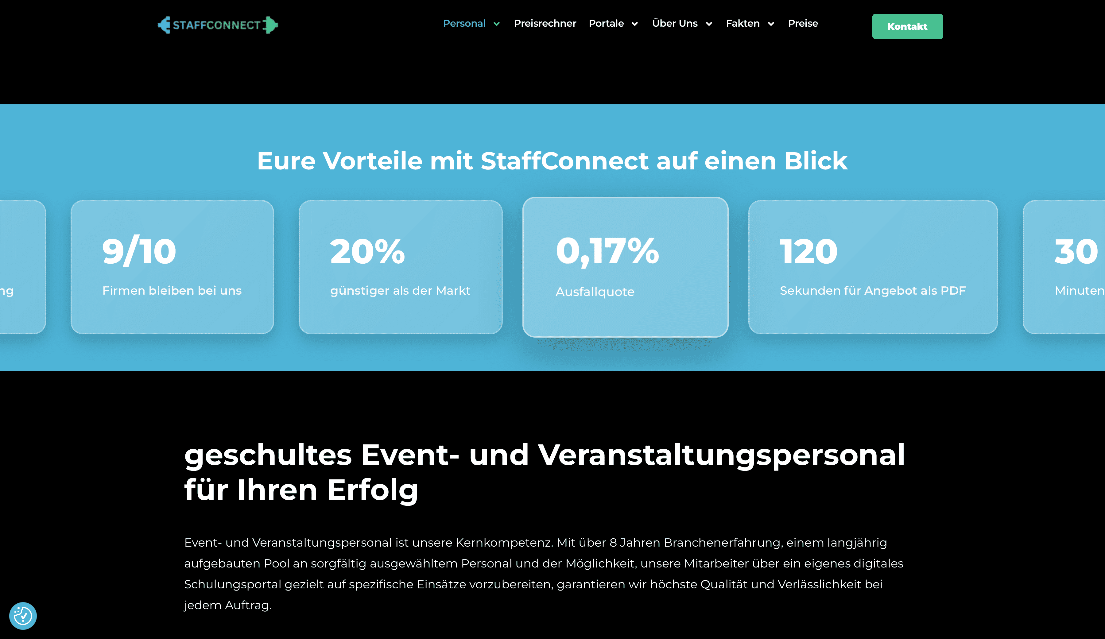 Für STAFFCONNECT entwickelten wir eine moderne Website, die weit mehr ist als ein digitaler Auftritt: Sie bildet das Herzstück der Corporate Identity. Durch ein klares, technologieorientiertes Design und eine präzise SEO-Strategie erreicht STAFFCONNECT in seiner Nische höchste Sichtbarkeit – sowohl in KI-gestützten Anfragen als auch im organischen Suchranking. Dank unserer Optimierung belegt das Unternehmen bei relevanten Keywords im Durchschnitt Platz 3 bei Google und wird in KI-Antworten konsequent als führender Anbieter genannt.